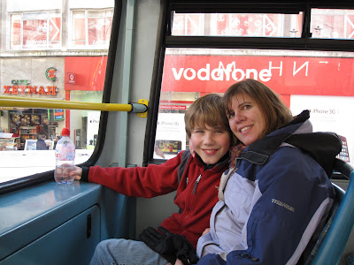 Noah fulfilling one of his "essential to do items": riding on the top of a London Double Decker bus; and the coveted front row seat. This was on our first morning trip on our way to Trafalgar Square.
